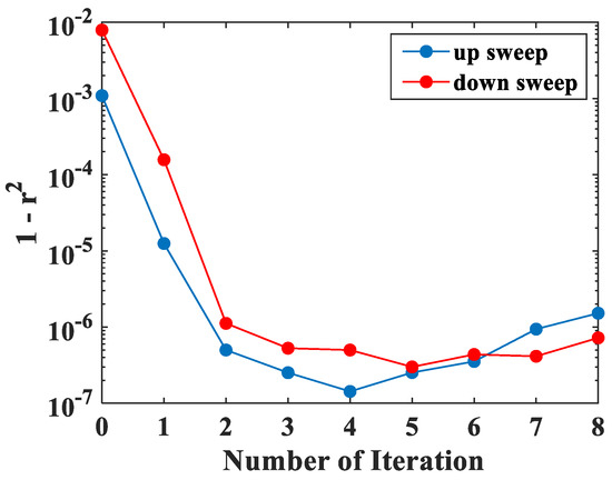It is worth mentioning that our method is able to achieve the DFB-LD linearly frequency-swept light wave output with a minimum number of iterations. In Figure 6, the of the down and up-sweep of a different iteration number is given. As can be seen from the figure, the best results appear in the 4th iteration, but when the number of iterations exceeds the 4th, the frequency swept linearity deteriorates because noise is introduced at each iteration with the algorithm, and with the accumulation of noise leads to a change in the trend of the frequency swept nonlinearity towards deterioration. Therefore, the 4th pre-distortion waveform is selected as the final drive voltage for linearly frequency-swept output, in our experiments.
