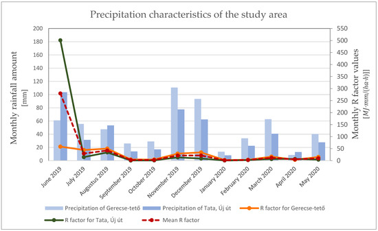 Precipitation data for the calculation of the R factor were provided by the National Meteorological Service of Hungary (OMSZ). Hourly data were available from two permanent monitoring stations closest to the study area, which were (1) Gerecse-tető and (2) Tata, Új út. Therefore, we could only make an estimate of the greatest 30 min intensity by taking half of the amount of the hourly measured precipitation. During the monitoring year, the Gerecse-tető station recorded 581.6 mm of precipitation, while the Tata, Új út station recorded 471.4 mm.