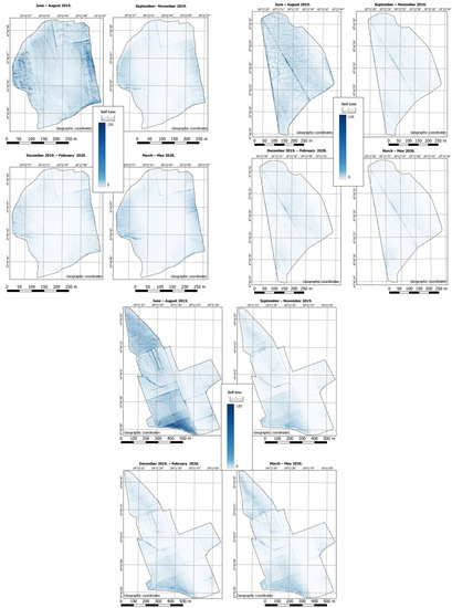 For all four periods (seasons), estimated soil degradation maps were produced for each study site (Figure 5). The maps show how many tons of soil eroded per hectare and per season.