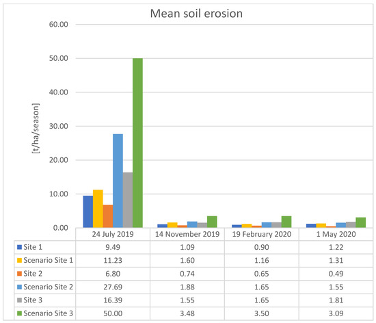 By comparing the scenario model results with the survey maps, the amount of soil that can be protected from degradation by grassland per cell could be determined. As there was a very small area of grassland in the original condition for site 1, the smallest discrepancy between modeled and surveyed erosion was found for the site. The differences were mainly found in the area of the older vineyard parcel overhanging the study site. For the other two sites, the differences were more significant. For site 2, there was significant variation along the watercourse that crossed the site, while for site 3 there were several priority areas which are as follows: the terraced parcel; the larger watercourses; and the parcels where cultivation was not perpendicular to the slope. The seasonal variation of the study sites are summarised in Table 8.