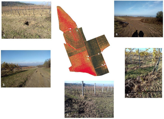 A number of previous studies focused on surface evolution in the area of the Gerecse Hills, which show that both soil erosion and landslides are significant land-forming factors in the present, e.g., [17,18,19,20]. The study area belongs to one of the well-known wine regions of Hungary, the Neszmély wine region. A major vineyard and winery of this wine region is the Hilltop Neszmély Ltd., Meleges-hegy, Hungary. In this area, several plantations of the company are threatened by soil erosion. The aim of this study was, by conducting short- and medium-term monitoring of vineyards at risk of high erosion, to produce seasonal, high resolution (10 cm/pixel) soil loss maps of the study areas. These were used to define critical zones within vineyards at high risk of erosion, and to estimate the soil loss and its dynamics of change during the year in each area.