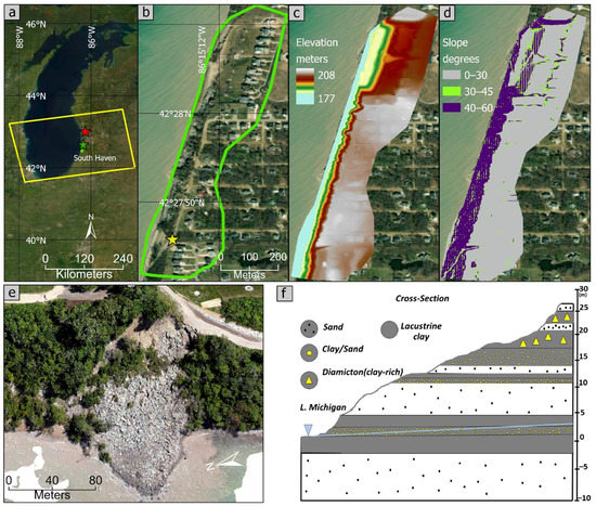 The Lake Michigan shoreline at the Miami Park subdivision (Figure 1a,b) is located 8 km to the north of downtown South Haven, Michigan, on US-31. Miami Park is located in the southeast section of the Lake Michigan shoreline, part of the Lake Border Moraine System [53,54]. The coastline comprises glacial deposits, including glacial till and outwash, lacustrine deposits, and dune deposits. The glacial tills are found on steep slopes along the shoreline bluffs and are composed of three main types: flow, melt-out, and lodgment tills [55]. Flow till resides within the upper strata of glacial ice, the melt-out along its shear planes, and the lodgment within its lower sections [51,53,54]. A generalized cross-section of the study area (Figure 1f) shows the top part to be composed primarily of gray, silty diamicton except for sand intercalations; the middle section of brown, fine-grained laminated clay, sand, and cross-bedded sand; and the bottom, fine-grained clay and fine- to medium-grained sand [12].