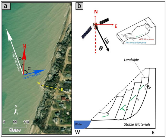 Figure 2a displays satellite flight (Φ~10.4°) and look direction (α~79.6°) in relation to the bluff’s slope orientation (N80W–S80E), represented by line W-E in Figure 2a. Figure 2b is a schematic cross-section along slope direction showing the bluff slope and its ablation and accumulation zones with respect to the satellite LOS incidence angle (θ~39.8°). Within the ablation zone, the downslope facilitates downward movement of earth material, a pattern indicative of a motion away from the satellite and represented by negative deformation velocities. In the accumulation zone, the displaced earth materials build up, producing a pattern indicative of a motion towards the satellite and represented by positive velocities. It is noteworthy to mention that the accumulation zone (bluff toe) is washed out during high LL periods. Hence, a motion towards the satellite (indicative of significant E-W movement) in the accumulation zone is not expected with ascending Sentinel-1 observations.