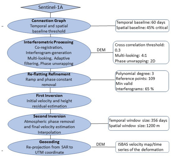 The workflow of the adopted ISBAS processing from interferogram generation to geocoding is shown in Figure 3. In the first step, the connection graph is constructed to select Sentinel-1 image pairs. Guided by the temporal and spatial baseline thresholds (60 days, 45% critical baseline), the graph defines the combination of SAR image pairs for interferogram generation by selecting the reference and secondary image pairs.