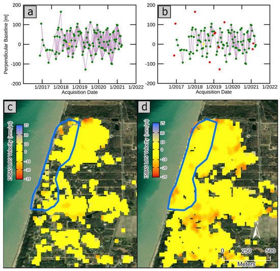 SBAS connection graphs (initial and refined) displaying the Sentinel-1 images (green dots), interferograms (lines connecting green dots), the reference image (yellow dot), and omitted images (red dots). (a) Initial SBAS connection network (Track 121) for all acquisitions (102 photos; 409 interferograms). (b) Refined connection graph after the exclusion of interferograms with low mean coherence (<0.3) (91 images; 229 interferograms). (c) Extracted deformation rate map over the study area (blue polygon) and surroundings based on the initial connection graph (d) Extracted deformation velocity map over the study area (blue polygon) and surroundings based on the refined connection graph. The average temporal coherence over the study area is 0.58 in Figure 4c and 0.8 in Figure 4d. Source of ArcGIS pro base maps in Figure 4c,d: Esri, DigitalGlobe, GeoEye, i-cubed, USDA FSA, USGS, AEX, Getmapping, Aerogrid, IGN, IGP, swisstopo, and the GIS User Community.
