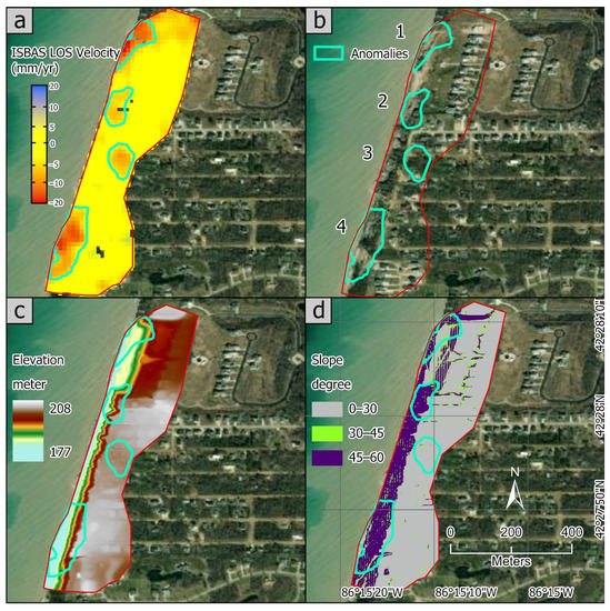 (a) ISBAS LOS velocity map over the study area created with a coherence threshold of 0.3 and applying 2D unwrapping methods show movement away (−8 to −21 mm/year) from the satellite in regions occupied by anomalies 1, 2, 3, and 4 (green polygons) in shades of red, surrounded by stable areas with no significant movement (+3 mm/year to −3 mm/year) in shades of yellow. (b) High-resolution (0.5 m) view of an ArcGIS Pro base map over the study area displaying locations of anomalies 1 through 4. (c) DEM derived from lidar data [57] (spatial resolution: 1 m), showing the distribution of anomalies 1 through 4, the shoreline, the bluff, and the plateau. (d) Slope map derived from lidar DEM showing the steep slopes (45°–60°) of the bluff face. Anomalies 1, 2, and 4 are located on the bluff, whereas anomaly 3 is over the plateau and extends westwards to the upper reach of the bluff. Source of ArcGIS pro base maps in Figure 5a–d: Esri, DigitalGlobe, GeoEye, i-cubed, USDA FSA, USGS, AEX, Getmapping, Aerogrid, IGN, IGP, swisstopo, and the GIS User Community.