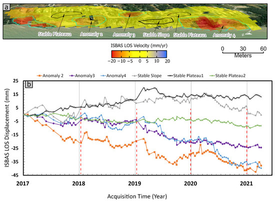 We interpret these findings to indicate that the applied ISBAS methodology can be used to identify areas where long-term slow LOS displacement away from the satellite and strong seasonal deformation cycles occur. In our case, those are regions (areas covered by anomalies 2 and 4) where freezing and thawing of groundwater are causing seasonal land deformation. The following section demonstrates that the identified anomalies over the bluff (anomalies 2 and 4) are more susceptible to landslide development (rapid catastrophic deformation).