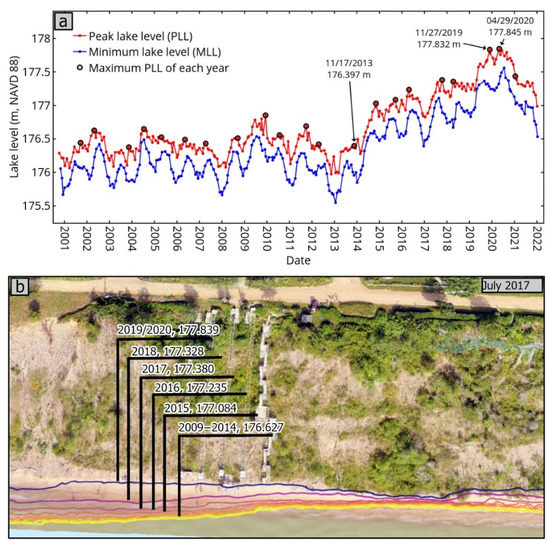 Next, we show that the landslides detected in the 2021 image are related to the PLL in 2019 and 2020. The rise in LLs caused toe erosion, which accelerated landslide development over bluff sections witnessing strong seasonal cycles and prolonged LOS deformation away from the satellite. Those sections are weakened by freeze and thaw of the bluff face and groundwater discharge. The rise in LLS also caused other landslides in areas where groundwater discharge did not play a role in bluff weakening. Figure 10a displays PLL and MLL over the past two decades measured at the Holland station. LLs were relatively stable from 2001 to 2013, yet witnessed a steady rise from 2014 to 2020, followed by a decline in 2021 and 2022. LL fluctuated by approximately 1.5 m (PLL: 2013 176.397 m; 2020 177.85 m) over the past two decades, an increase that advanced the shoreline towards the bluff. Depending on the width and slope of the coastal plain, the wind direction, and velocity, the waves will occasionally reach the toe of the bluff and erode it away, triggering landslides. For demonstration purposes, we overlaid PLL for 2001 through 2020 onto the 2017 UAV image (Figure 10b) over an area outlined by a black box in Figure 8c. Given the minor variations in PLL in the years 2001 through 2013, the PLL for those years were plotted as a single line in Figure 10b (yellow line), and so are the PLLs for years 2019 and 2020; they too were similar and were plotted as a single line on Figure 10b (blue line). Inspection of Figure 10b shows progressive encroachment of the waterfront towards the bluff, reaching its toe by 2019, a setting conducive to bluff toe erosion and landslide development. The LLs fluctuate throughout the year as well. They are at their lowest in February, when the precipitation is locked as snow accumulation on land, and at their highest levels in July. At this time, much of the snow would have melted, and the runoff had made it to the lake.