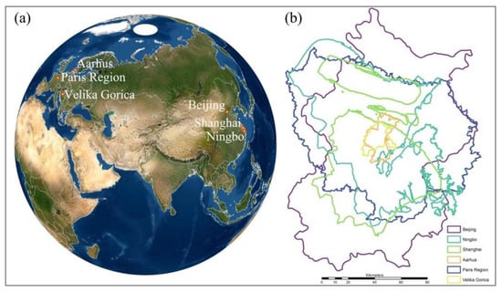 Our analysis comprises three Chinese cities (Beijing, Shanghai, and Ningbo) as well as three European Cities (Paris region—France, Aarhus—Denmark, and Velika Gorica—Croatia) (Figure 1). Among the three Chinese cities, Beijing is the capital of China, with an area of 16,410 km2 and a population of 21.7 mio. Between 2000 and 2020, Beijing experienced significant urbanization with an increase in the built-up area from 1640 km2 to 2859 km2. Much larger in terms of population is Shanghai, with a total area of 6340 km2 and a population of 24.2 mio. It has also experienced significant urban expansion over the past 20 years, with the built-up area increasing from 1414 km2 to 2793 km2 by 2020. While Ningbo is smaller than Beijing and Shanghai in population (5.7 mio.), it is also rapidly gaining built-up area, growing from 1023 km2 in 2000 to 1857 km2 in 2020. These cities represent typical Chinese urbanization patterns of megacities and cities with over a million inhabitants. Amongst the European study sites, the Paris region is the biggest urban agglomeration, and one of the few megacities in this continent. It is France’s capital and home to 18.2% of the country’s population (12 mio.) in which the built-up area grew from 1680.4 km2 to 1884.7 km2 between 2000 and 2020. With 273,000 inhabitants, Aarhus, Denmark, has experienced slow urbanization over the past 20 years, changing its built-up area from 77 km2 to 85 km2. In Croatia, Velika Gorica has 64,000 residents, with an average population density of 272 people per km², and its built-up area has been decreasing from 23 km2 to 17 km2 during the past twenty years [23]. So, the European study sites cover the types of a megacity, a typical mid-sized city, and a town.