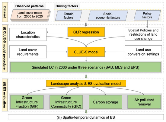 In this study, a comprehensive framework was constructed to evaluate GI and ES in the past and future. The procedure is shown in Figure 2 and consists of three main parts, including (i) the simulation of land cover for 2030 under three different development scenarios using the CLUE-S model; (ii) evaluating the ES based on several ES evaluation models; and (iii) evaluating the spatio-temporal dynamics and distribution equity of ES.
