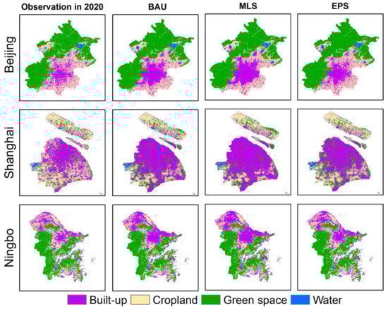 For the three Chinese cities, the built-up area shows rapid growth in all three development scenarios. Specifically, in Beijing, the built-up area grew up to the 643.2 km2 (BAU), 965 km2 (MLS), and 322 km2 (EPS) scenarios by 2030, where almost all (98.7%, 92.3%, and 99.3%) new built-up space was transformed from arable land. In Shanghai, the built-up area increased to 819 km2, 1223 km2, and 413 km2 under the BAU, MLS, and EPS scenarios by 2030. It is worth noting that in all three scenarios in Shanghai, the area of forest grows, mainly converted from cropland, with forest area increasing by 371 km2, 224 km2, and 518.5 km2 in BAU, MLS, and EPS, respectively. In Ningbo, the built-up area increased by 476 km2 (BAU), 720 km2 (MLS), and 215 km2 (EPS). Under the BAU and MLS scenarios, 151 km2 and 189 km2 of forest were converted to cropland, respectively. Overall, the three cities will continue to experience extensive urban expansion in terms of built-up area over the next ten years, with average growth rates of 23.8% (BAU), 35.9% (MLS), and 11.6% (EPS). In the process, cropland will become less available, with average reductions of 24.1% (BAU), 28.6% (MLS), and 19.5% (EPS) in the three cities. The green space area in the three cities shows different trends from 2020 to 2030, with Beijing and Ningbo showing relatively few changes in the green space area under the three scenarios, while in Shanghai, the green space area increases to varying degrees under the three scenarios, at 39.5 km2 (BAU), 19.9 km2 (MLS), and 58.8 km2 (EPS).