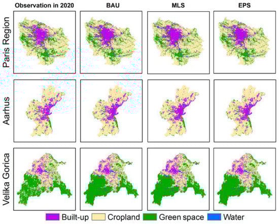 The land-cover patterns of the three European cities for the year 2030 are shown in Figure 4. The Paris region and Aarhus exhibited relatively little urban expansion between 2020 and 2030, with Paris showing built-up area growths of 111 km2 (BAU) with a growth rate of 5.5%, 116 km2 (MLS) with a growth rate of 8.3%, and 56 km2 (EPS) with a growth rate of 2.8%. Velika Gorica demonstrated a relatively significant urbanization intensity, with built-up area growths of 6.6 km2 (19.6%) (BAU), 10.1 km2 (29.9%) (MLS), and 3.1 km2 (9.3%) (EPS), respectively. The average growth rates of built-up area in the three municipalities range from 10% (BAU) to 15.2% (MLS) and then drop down to 5% (EPS). The average decreases in cropland area are 6.8% (BAU), 7.6% (MLS), and 6.1% (EPS). There are differences in the trends of green space in the three cities: specifically, the green spaces in Aarhus and Velika Gorica show an increasing trend, while the area of green space in the Paris region decreases in all scenarios, with decreases of 5.3% (BAU), 5.9% (MLS), and 4.8% (EPS).