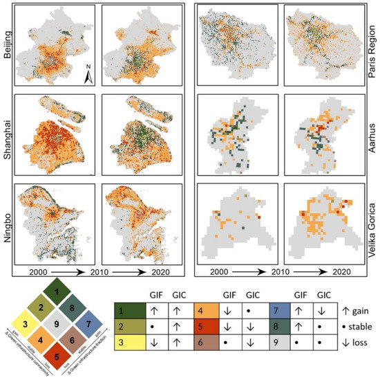 Table 2 shows the SI of various indicators related to land-cover changes. Overall, most of the SIs for the four different indicators are less than 0, indicating that land-cover changes in the six cities have a negative impact on the coverage and connectivity of GI, as well as on the amount of carbon sequestration and air pollution removal. Based on observations from 2000 to 2020, land-cover change showed a positive effect on carbon stock and PM2.5 removal from 2000 to 2010 in Beijing, while land cover in Shanghai continued to positively affect carbon stock and PM2.5 removal from 2000 to 2020. In Ningbo, land-cover change had a positive effect on PM2.5 removal only from 2000 to 2010. For the three European cities, land-cover change had a small positive effect on carbon stock and PM2.5 removal between 2000 and 2020, while in Aarhus, the land cover had a positive effect on carbon stock and PM2.5 removal between 2010 and 2020, where SIcarbon was 0.02, and SIpm2.5 was 4.16. In Velika Gorica, there was a continuous positive effect of land cover on both carbon stock and PM2.5 removal between 2000 and 2020.