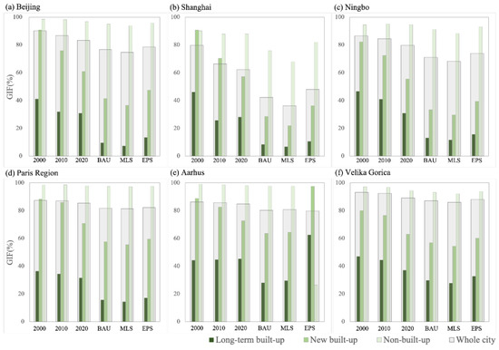 The GIF and GIC in different scenarios in 2030 show a big difference between cities in China and Europe (Figure 6). In China, the average GIFs for the three cities are 59.7% (MLS), 63.3% (BAU), and 66.8% (EPS). In the EPS scenario, GIF increased by 7.1% relative to the MLS scenario, and GIC increased by 18.7 relative to MLS. In the three European cities, the GIFs were 82.7% (MLS), 83% (BAU), and 83.4% (EPS), and the GICs were 90.3 (MLS), 91.3 (BAU), and 92.3 (EPS), respectively, with small differences across scenarios.
