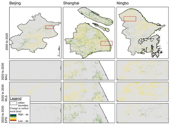 Carbon stock in Beijing, Shanghai, and Ningbo for 2000 to 2020 and 2020 to 2030 under three different scenarios (BAU, MLS, and EPS). Lower panels show detail within red boxes shown in upper panels.