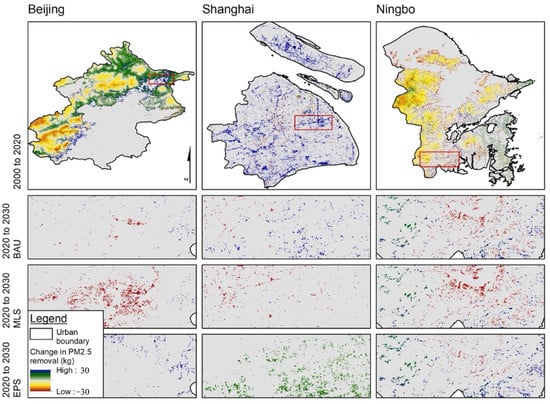 Distribution of PM2.5 removal changes in Beijing, Shanghai, and Ningbo for 2000 to 2020 and 2020 to 2030 under three different scenarios. Lower panels show detail within red boxes shown in upper panels.