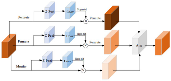 Triplet attention [29] is a lightweight but effective module that enables cross-dimensional information interaction through rotation operations, providing significant performance gains at a reasonable computational cost. This module mainly contains three branches, two of which are used to capture the cross-channel interaction between the channel C dimension and the spatial dimension , respectively, and the remaining one is the calculation of the traditional spatial attention weight. For example, the interaction process of channel C and space W dimension is as follows: first, perform a permute operation on the input feature () to yield a dimension feature, and then perform Z-pool, convolution, and sigmoid activation function operations on the H dimension, generate spatial attention weights, and finally generate output features () through permutation. Among them, Z-pool consists of average pooling and max pooling. The interaction process of channel C and spatial H dimension is similar. The traditional spatial attention branch has no permutation operation, and other operations are similar. Finally, the output information of the three branches is added, and the average value is the final module output. The model structure diagram is shown in Figure 1.