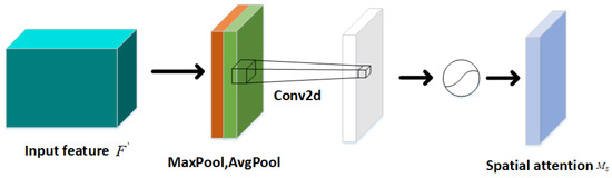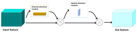 CBAM [30] is a simple and efficient convolutional neural network attention module containing two independent submodules, CAM and SAM, focusing on channels and spatial features, respectively, by which independent information inhibits and enhances the expression of the main information in the feature map [31], as shown in Figure 2, Figure 3 and Figure 4. For any given input feature map , the channel attention module presses the feature map by using global maximum pooling and mean pooling to obtain two channel descriptions, and , adds the two pooled one-dimensional vectors to the full connection layer operation, and then passes a sigmoid activation function to obtain the weight factor . After this, the weight factor F is multiplied by the element of the original feature graph to get the new feature graph . The spatial attention module performs global max pooling and average pooling on according to the space to obtain two two-dimensional vectors and . After splicing the two two-dimensional vectors generated by the pooling, a 7 × 7 convolution operation is performed, the activation function is sigmoid, and the weight coefficient is obtained. Finally, the weight coefficient and are multiplied element by element.