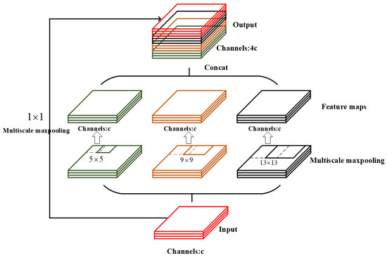 SPPNet [34] uses four different scales of maximum pooling to process the feature map. The size of the pooling kernel of the maximum pooling is 1 × 1, 5 × 5, 9 × 9, and 13 × 13, and the 1 × 1 pooling kernel operation can be regarded as no processing, as shown in Figure 8. In this paper, SPPNet is placed in the last layer of the backbone extraction network as a pooling layer, and multiple pooling windows are used to process the feature information to separate the feature information of the significant upper and lower layers, thereby greatly increasing the network receptive field.