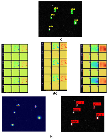 To further dissect the FIERNet detection process, we show the feature information changes of the FIERNet network during the ship detection process in Figure 17. From Figure 17b we can clearly see that all three detection heads of FIERNet capture the main feature information that is beneficial for ship detection. Even the eigenhead (16 × 16), which is mainly used for large target detection, obtains obvious target information, marking the approximate location of the ship target. Combining the other two detection heads with more explicit ship feature information, we can finally get Figure 17c. Comparing Figure 17a, we find that FIERNet detected all the targets, and we compared the position and size of the detection box and the real box to find that they were basically the same. This verifies the validity and soundness of the method proposed in this paper.