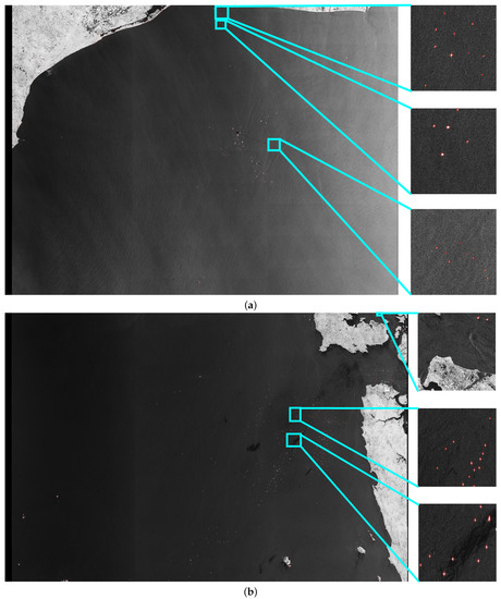 SSDD dataset: SSDD is the first publicly available dataset for SAR ship target detection. It consists of 1160 images containing 2456 ship targets with a resolution of 1–15 m. The dataset is divided into many different scenes, including simple scenes with clean backgrounds, complex scenes with obvious noise, dense scenes with complex environments, and near-coastal buildings disturbing scenes. However, the results obtained on such a dataset are more credible. We set the ratio of training and test sets to 8:2.