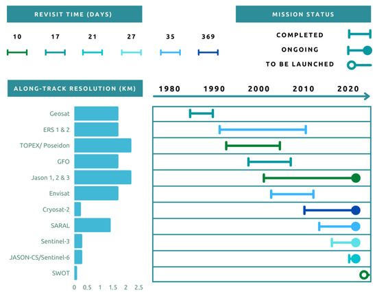 Satellite altimetry missions compatible with teroVIR and teroWAT processors, from first available operational data (GeoSat, starting 1986) until present and future launches.