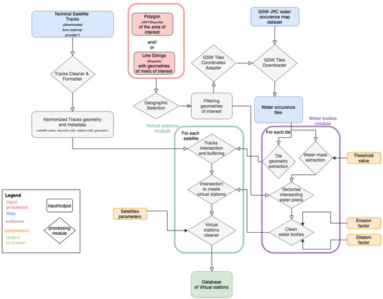 The teroVIR processor derives virtual stations by crossing the altimeters’ buffered nominal reference tracks with water masks extracted from JRC GSWE. In order to fulfill long data record requirements [26], no interleaved and drifting orbits are considered, since satellite missions follow their nominal reference tracks repeatedly during most of their operational life. In the following, we describe the built teroVIR framework, illustrated in Figure 2.