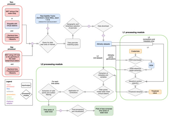 When water level data are not available, their computation requires altimetry data access at different levels of processing and from the various satellite missions providing measurements. However, radar altimeter orbits and elevation retrieval technology were originally designed for observing oceans, implying a design of their spatial resolution limiting to 1000 m river width measurements for most of the missions [22]. Moreover, retrieving water heights from altimeter range data requires a great deal of processing for rivers, as surrounding land introduces noise in the system conceived for open water. As indicated in the Method column of Table 1, references of the algorithms used to extract water level heights from altimetry data show that these large datasets rely on L2 data-based products with ocean or ice retrackers [15,20,21,23] and applying post-processing outlier rejections, while DAHITI [16] uses L1 data-based algorithms. Although the BRAT toolbox [24] was conceived to process these raw data, downloading and processing the altimetry data for large-scale sites remain a challenge, which the AltEx software [25] intended to tackle in 2019. An open-source platform with a web-viewer was built to explore altimetry database availability and access water level time series information on-the-fly. However, considered missions were limited to Jason 2-3 and the web-viewer does not seem to be maintained anymore, neither does the API access to data. Moreover, AltEx does not verify whether users have selected points over water.