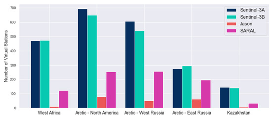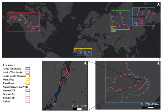 The total surface covered in Kazakhstan is 283,905 km2 (roughly 10% of the total surface of this country), which has been suffering from severe flood events while its monitoring remains very sparse, as demonstrated. The Arctic area is covered with small water bodies, which may not influence much the water balance of a catchment, and therefore having prior information of major river lines helps to only run the teroVIR processor where needed. These river lines have been derived by hydrological experts and divided into three regions, namely North America, West Russia and East Russia. A description of the missions providing data for all areas of interest stations can be observed in Figure 5. While the JS 1-2-3 sequence ensures 10 years of continuous data, the spatial coverage is significantly lower than for S3A and S3B, which are only available since 2016 and 2018, respectively, and than for SRL, deprecated (on drifting orbit mode) since July 2016.