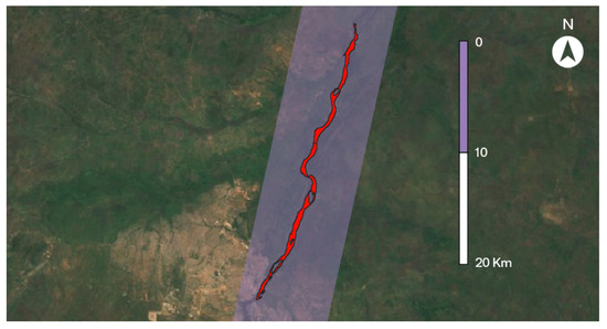 Virtual station (in red) leading to unreliable water level time series. The orientation of the river bed follows the S3 satellite track (in purple) over almost 30 km. For each date, all pulse observations falling into this geometry are averaged introducing artifacts due to great variations occuring along the river.