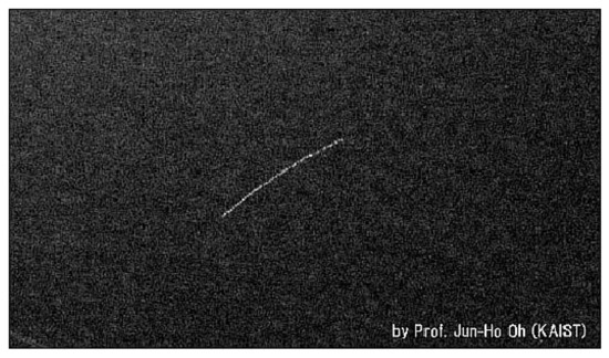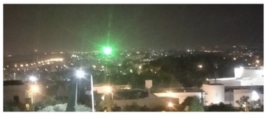 The space laser–communication research field is not limited to the Earth–space link. New space developments can also support satellite networks which are based on laser communication. NASA has already created the CubeSat Laser Infrared CrosslinK (CLICK) [15] mission to demonstrate a full-duplex optical communication crosslink between two 3 U small spacecrafts in LEO. The goal of this mission is to create a satellite constellation or swarm that carries one or more moderate- to high-resolution imaging or scientific sensors and communicates at high speed. The concept of a nano-satellite with emitting lights that should be visible by the naked eye was first implemented on the FITSat-1 nano-satellite [16]. Figure 2 presents the first LED flashing of FITSat-1 (2012). Finally, NASA’s Terabyte InfraRed Delivery (TBIRD) program is designed to allow 200 Gbps laser communications system for LEO direct-to-Earth missions; recent preflight tests [17] show promising results regarding the ability of optical ground stations to track and establish laser links with FSO nano-satellites.