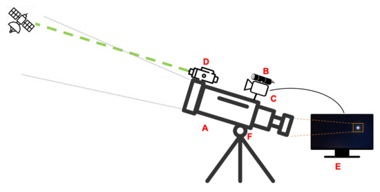 The ground station components: (A) telescope; (B) laser beam (laser beacon); (C) wide FOV camera; (D) FSO transmitter; (E) image processing component; and (F) gimbal mount with two degrees of freedom system (pitch and yaw) and aiming control.