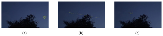 Satellite detection demonstration via video processing: (a) tracking the ISS at its rise; (b) tracking the ISS via video processing using the Kalman filter algorithm (note that the video was shot in low resolution, causing tracking breaks in several places); and (c) the final phase of the tracking (credit to RichardB1983 for the raw video).