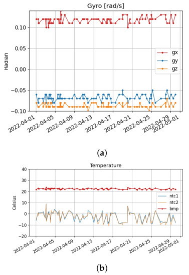 (a) The angular speed of SATLLA-2B in each axis, as captured by the onboard MEMS-gyro. (b) The temperature (in Celsius) of the satellite as sensed in the batteries (, ) and in the satellite’s IMU ().