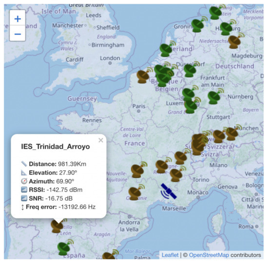 Several preliminary experiments are performed on this pico-satellite in order to test the FSO demonstration payload. It should be noted that the general concept of global RF communication (via LoRa protocol) was already demonstrated successfully, using the wonderful initiative of “TinyGS” [45]. Figure 11 displays a real RF beacon packet that was transmitted by SATLLA-2B and was captured by 15 amateur (RF) ground stations in a distance exceeding 1500 km.