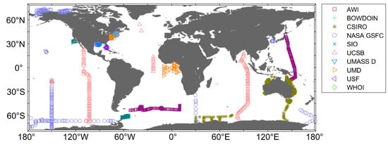 Location of the study area with sampling stations. The institutions providing data were the Alfred-Wegener-Institute Helmholtz Centre for Polar and Marine Research (AWI), Bowdoin College (BOWDOIN), Commonwealth Scientific and Industrial Research Organization (CSIRO), NASA Goddard Space Flight Center (NASA GSFC), University of California, San Diego Scripps Institution of Oceanography (SIO), University of California, Santa Barbara (UCSB), University of Massachusetts Dartmouth (UMASS D), University of Maryland (UMD), University of South Florida (USF) and Woods Hole Oceanography Institute (WHOI).