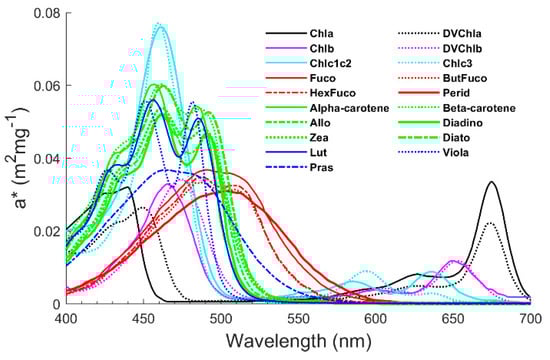 In vivo weight-specific absorption spectra of the main pigments, a*. The same colour represents the same type of pigments. Absorption spectra of primary photosynthetic and photoprotective carotenoids are shown in red and green, respectively. See Table A1 for details on pigment categories.