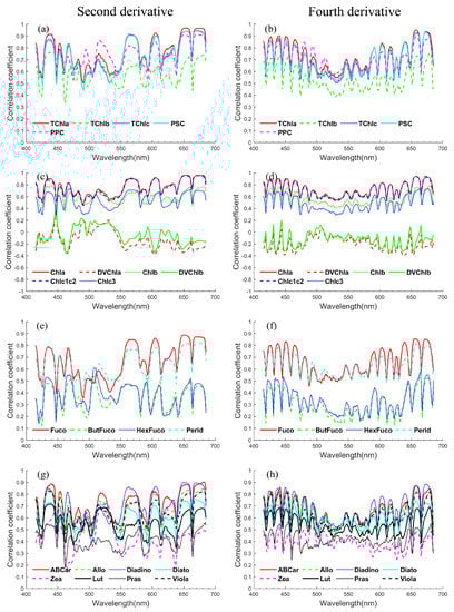 Appendix B.3. Correlation Coefficients of Phytoplankton Absorption and Derivative Spectra