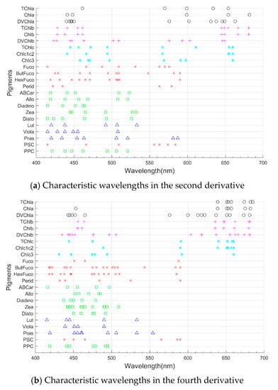 For most pigments (e.g., TChlb), the positions of many characteristic wavelengths selected by the ES-SR method at are similar to those selected at , and this similarity distribution of characteristic wavelengths from and can indirectly verify the reliability of the ES-SR method (Figure 4). For most pigments, there is also some degree of difference in the location distribution of the characteristic wavelengths selected at and . For example, the ES-SR method selected two explanatory variables of Fuco at 500–530 nm for (Figure 4a), although no explanatory variables were selected in the corresponding interval of (Figure 4b). The ES-SR method selected one explanatory variable of Perid at approximately 480 nm for , and no explanatory variables were obtained in the corresponding interval of . Thus, the second derivative and fourth derivative transformations have advantages in the spectral feature mining of phytoplankton pigments.