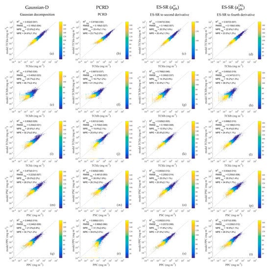 Comparison of phytoplankton pigment group values retrieved using the Gaussian decomposition method (a,e,i,m,q), PCRD method (b,f,j,n,r), ES-SR on (c,g,k,o,s) and ES-SR on (d,h,l,p,t) with measured values. The horizontal axis represents measured pigment concentrations, and the vertical axis represents estimated pigment concentrations. The dashed line is a one-to-one line. The colour scale represents the density.