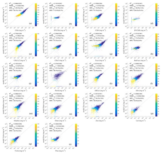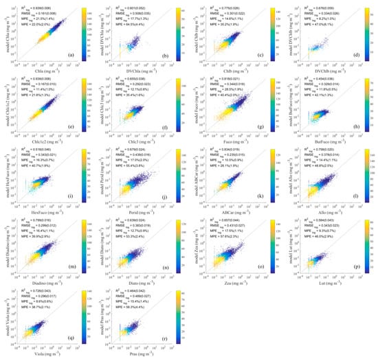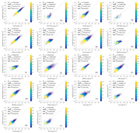 Comparison of detailed phytoplankton pigment values retrieved using the ES-SR method on (a–r) with measured values. The horizontal axis represents measured pigment concentrations, and the vertical axis represents estimated pigment concentrations. The dashed lines are the one-to-one lines. The colour scale represents the density.