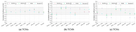 The ES-SR method on is the best method for the inversion of TChla, TChlb, TChlc, PSC and PPC (Figure 5), and its values are the highest among those of all inversion methods, with values of 0. 947, 0.768, 0.926, 0.893 and 0.892, respectively, which are significantly higher than those of the Gaussian decomposition method and PCRD method. The (0.146–0.300), (13.5–25.0%), and (20.4–33.9%) values obtained for the inversion results of the ES-SR method on are also significantly lower than those of other methods. The inversion accuracy of the TChlb concentration was the lowest among the inversion accuracies of the five pigment group concentrations retrieved by the ES-SR method on , which may result from the relatively low concentration distribution of TChlb (Table A2) since a lower pigment concentration distribution implies less spectral information. In addition, the inversion results of the ES-SR obtained for pigment group concentrations were similar to those of the ES-SR method on , and the former results are slightly less accurate but mostly higher than the results of the Gaussian decomposition method and PCRD method in accuracy.