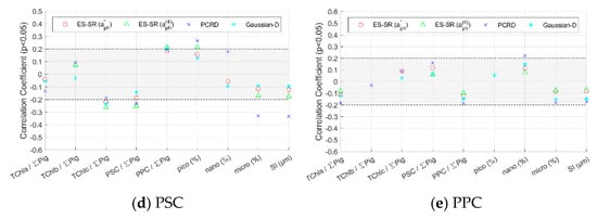 To evaluate the robustness of inversion methods and determine the primary cause that influences the method accuracy, the impact of phytoplankton size class and pigment composition on inversion methods was assessed. The Pearson’s correlation (R) values between the absolute values of the relative deviation of the pigment concentrations retrieved using various inversion methods and impact factors (pigment composition and size class) were calculated and are shown in Figure 9 and Figure 10. When the significance level p of R is greater than 0.05, the impact factors have an insignificant influence on the pigment concentration inversion method and are not labelled in the figure. The higher the absolute value of R is, the stronger the influence of the impact factor on the inversion method. When the absolute value of R is small, the influence of the impact factors is not obvious, so this paper focuses on the regular analysis of the impact factors for absolute values of R greater than 0.2.