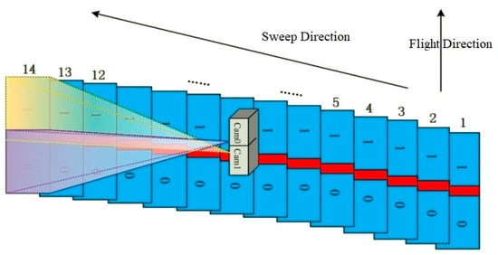 During the flight, a sequence of frames is exposed in a cross-track direction at a very high speed to provide a very wide angular coverage of the ground. The two lenses of the camera simultaneously sweep across the flight direction from one side to the opposite side, with each CCD capturing about 27 frames (54 frames for two CCDs) and having a maximum sweep angle of 104 degrees. After completing the first sweep, the lenses return to the start position in preparation for the next sweep. The sweep back time is 0.5 s. Each CCD captures seven frames per second (one frame in 0.142 s); therefore, a single sweep is completed in approximately 3.6 s. The time between sweeps depends largely on the aircraft speed, flight altitude, and the required overlap between two consecutive sweeps. For more details on the technical parameters, refer to Pechatnikov et al. [].