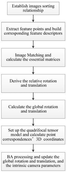 After performing the Bayesian inferences, the initial global rotations are computed for each view in a global coordinate system, while the initial global translations are generated using the initial POS data or from the translation registration. The quadrifocal tensor model can then be established, and the initial three-dimensional coordinates of the matching point correspondences in each quadrifocal tensor model are calculated. Finally, the BA cost function based on the quadrifocal tensor model is constructed and used in the BA processing. The global rotation matrix and the translation vector for each view are updated, and the intrinsic parameters are calibrated simultaneously. The general workflow is listed in Figure 5.