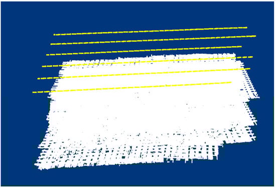 The fourth experiment was carried out using the original OpenMVG pipeline. All unknowns were considered, and the same group of GCPs and CHKs were used in the adjustment. A total of 6,797,129 pairwise point correspondences were extracted from matching. The statistical results are shown in Table 6. The sparse point cloud is displayed in Figure 12.