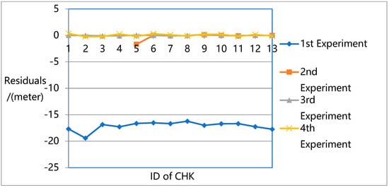 To better compare and analyze the different test results, the residuals from Table 2, Table 3, Table 4 and Table 6 were plotted. Figure 13 present the residuals at each CHK in the X-direction, Figure 14 show the residuals in the Y-direction, and Figure 15 provide the residuals in the Z-direction. Figure 16 present a more detailed comparison of residuals in the Z-direction.