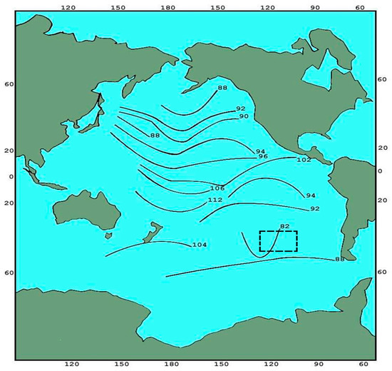 Radio brightness temperature map of the Pacific Ocean. The area (48°S, 35°S; 110°W, 130°W) is marked with a dashed line.
