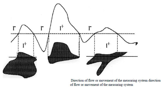 Let us look at some aspects of data processing received from the “Cosmos-1500” satellite in February 1984. The thematic processing of the remote sensing data was carried out in the following order. According to the synoptic map, a specific area (−48°S, −35°S; 110°W, 130°W) or (48°S, 35°S; 110°W, 130°W) over the Pacific Ocean was selected as the object of study (see Figure 1). Then, according to the given or the calculated thresholds {Xi}, samples of l+ and l− characteristics were formed [1,18,19,20]. The scheme for measuring the characteristics of “spotting” of the aquatic environment is shown in Figure 2 (details are given in the block diagram of Figure 3).