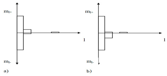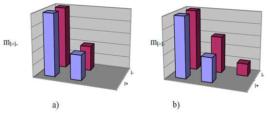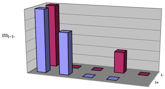 Let us introduce the following notation: ml+—frequency of hit values from the sample of positive spots in the sampling interval; ml−—hit frequency of values from a sample of negative spots in the sampling interval; ml+l−—is the frequency of the combination hit of pairs of negative and positive spots in the respective sampling interval. Then, {ml+}, {ml−} are the distribution histograms of positive and negative spots, respectively, {ml+l−} is the histogram of the joint distribution of the positive and negative spots.
